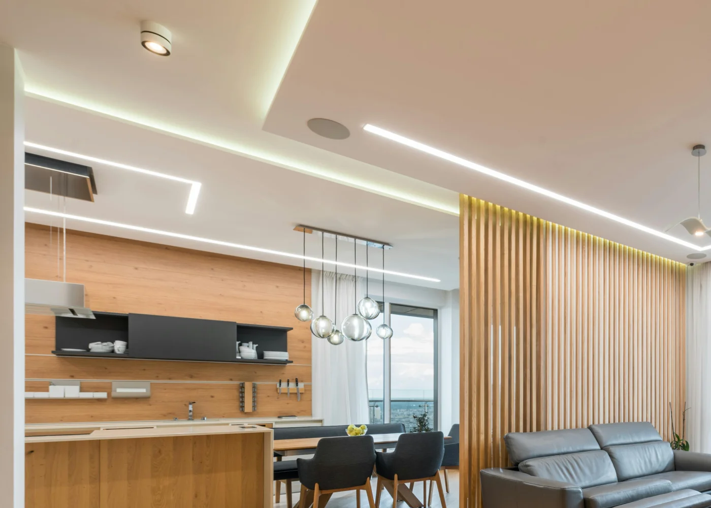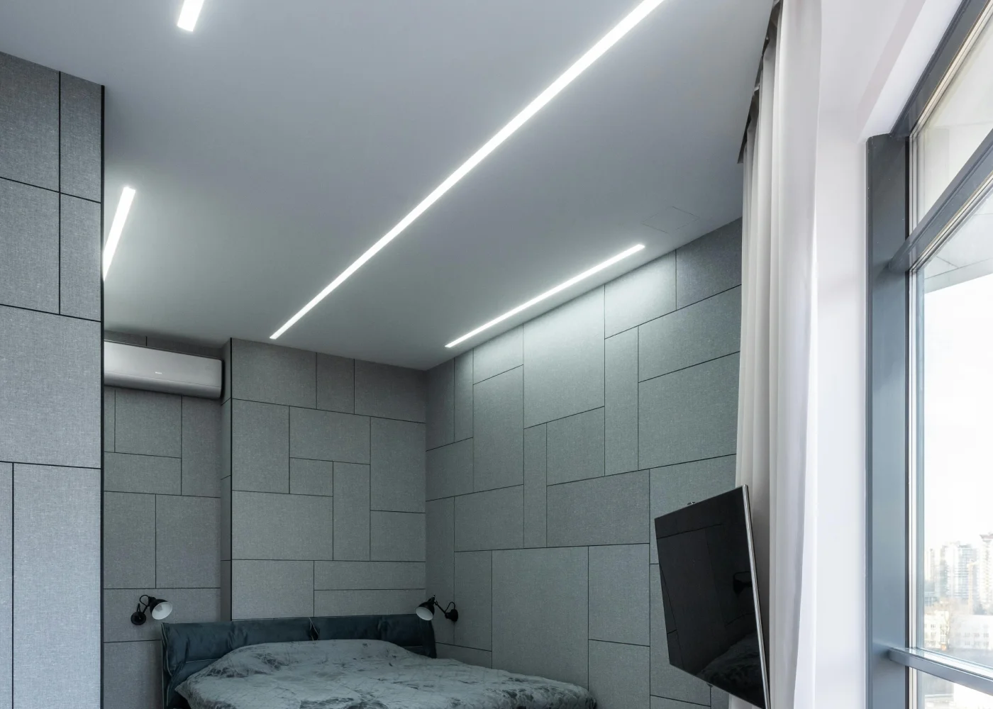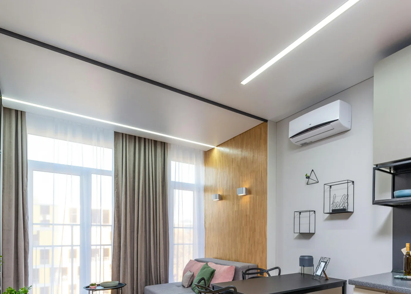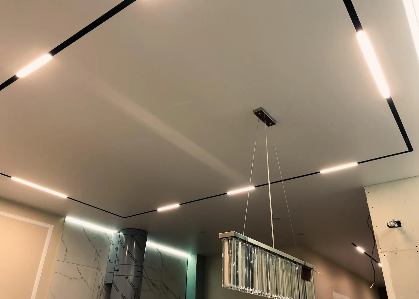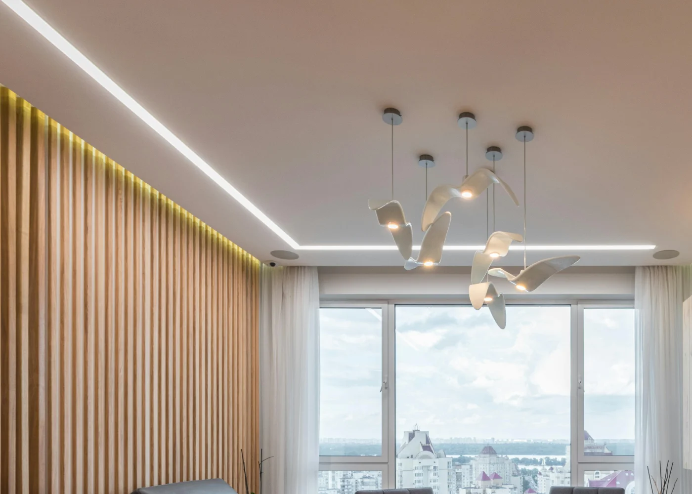 Световые линии преображают обычный потолок. Их главное достоинство — равномерно и ярко освещают комнату, придают ей стиль. Такое освещение приятнее человеческому глазу и позволяет не загромождать потолок люстрой.